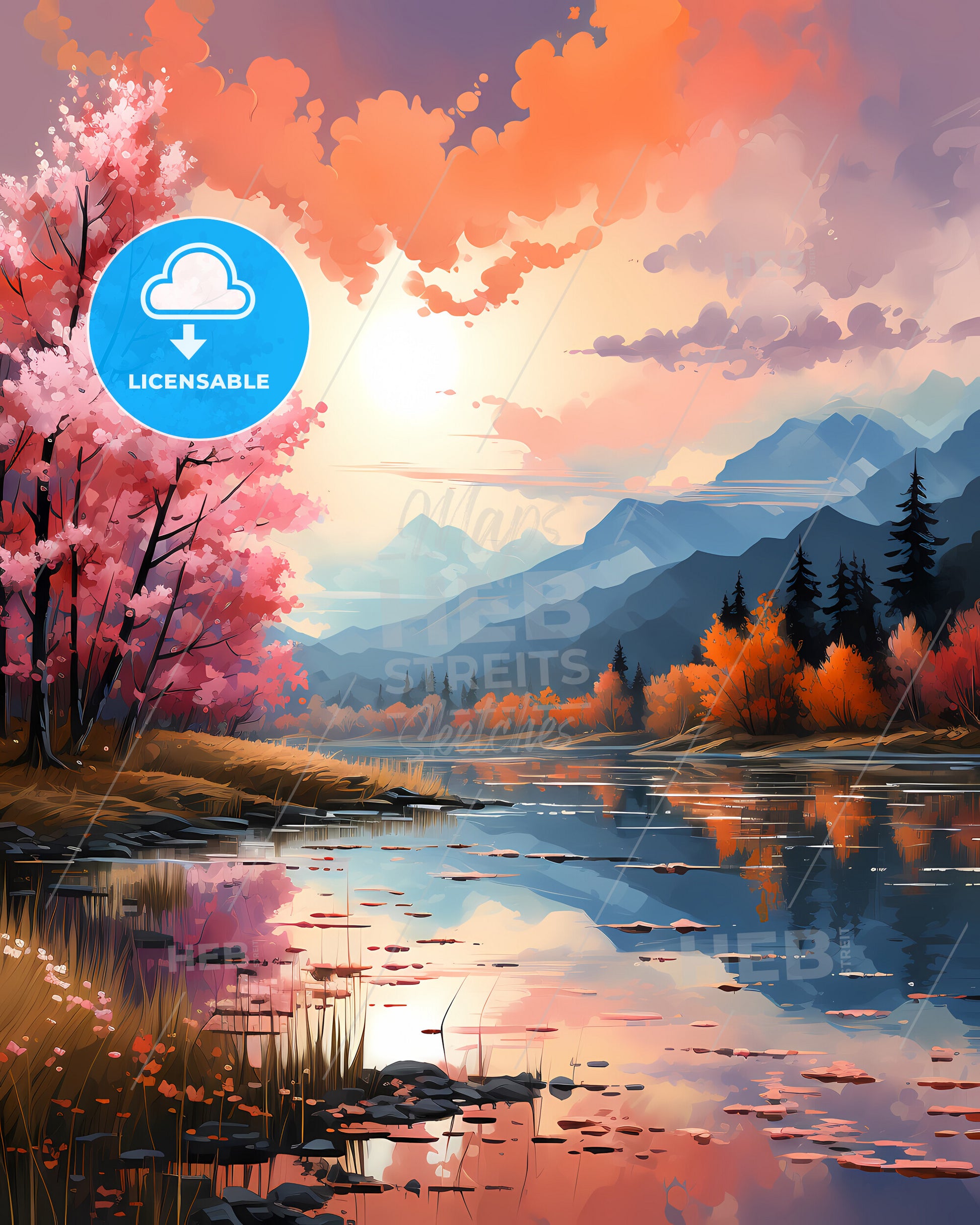 Steenwijkerland, Netherlands, a lake with pink trees and mountains in the background