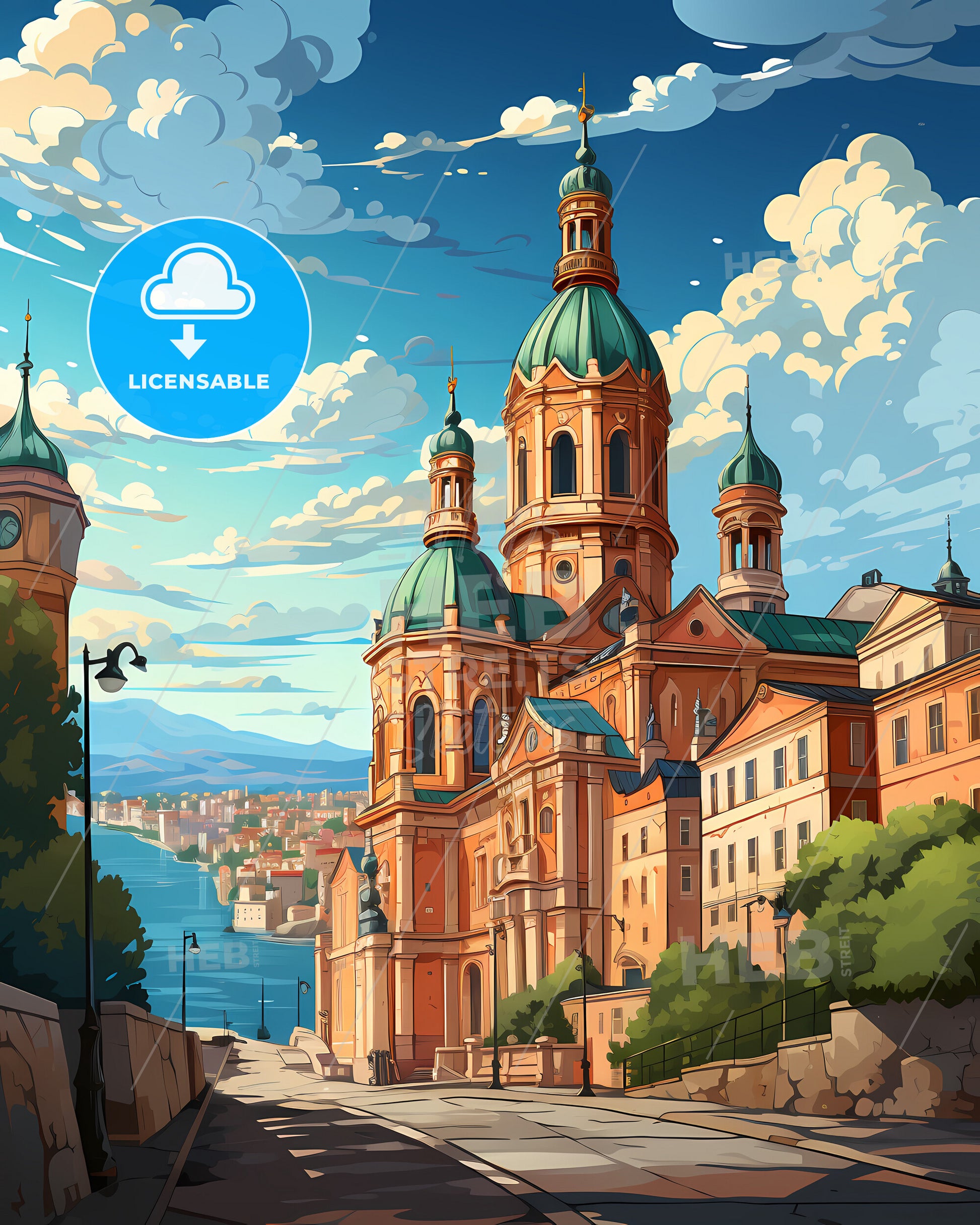 Stockholm, , Sweden, Skyline. art painting with blue sky some bright clouds in spring. in style of classic advertising illustration with nice gradients. Nice strokes and outlines that captures the playful spirit and vivid imagination of modern art.