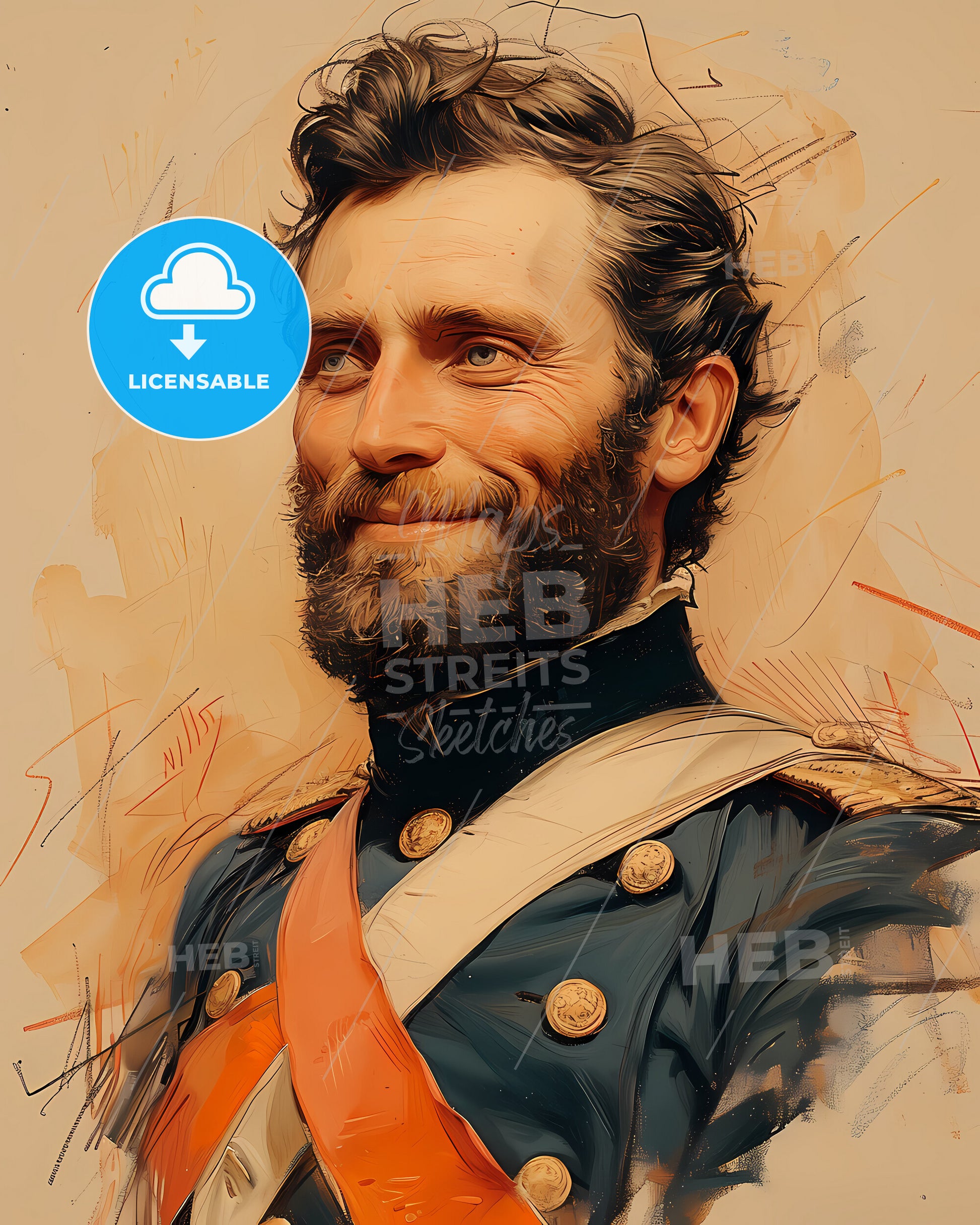 Portrait of Stonewall Jackson (Thomas J. Jackson), 1824 - 1863, Military Leader, Confederate general known for his tactical brilliance in the American Civil War. smiling. Vintage art illustration on bright beige paper background, sweeping overdrawn lines, subtile colored artwork, that captures the playful spirit and vivid imagination of modern art.