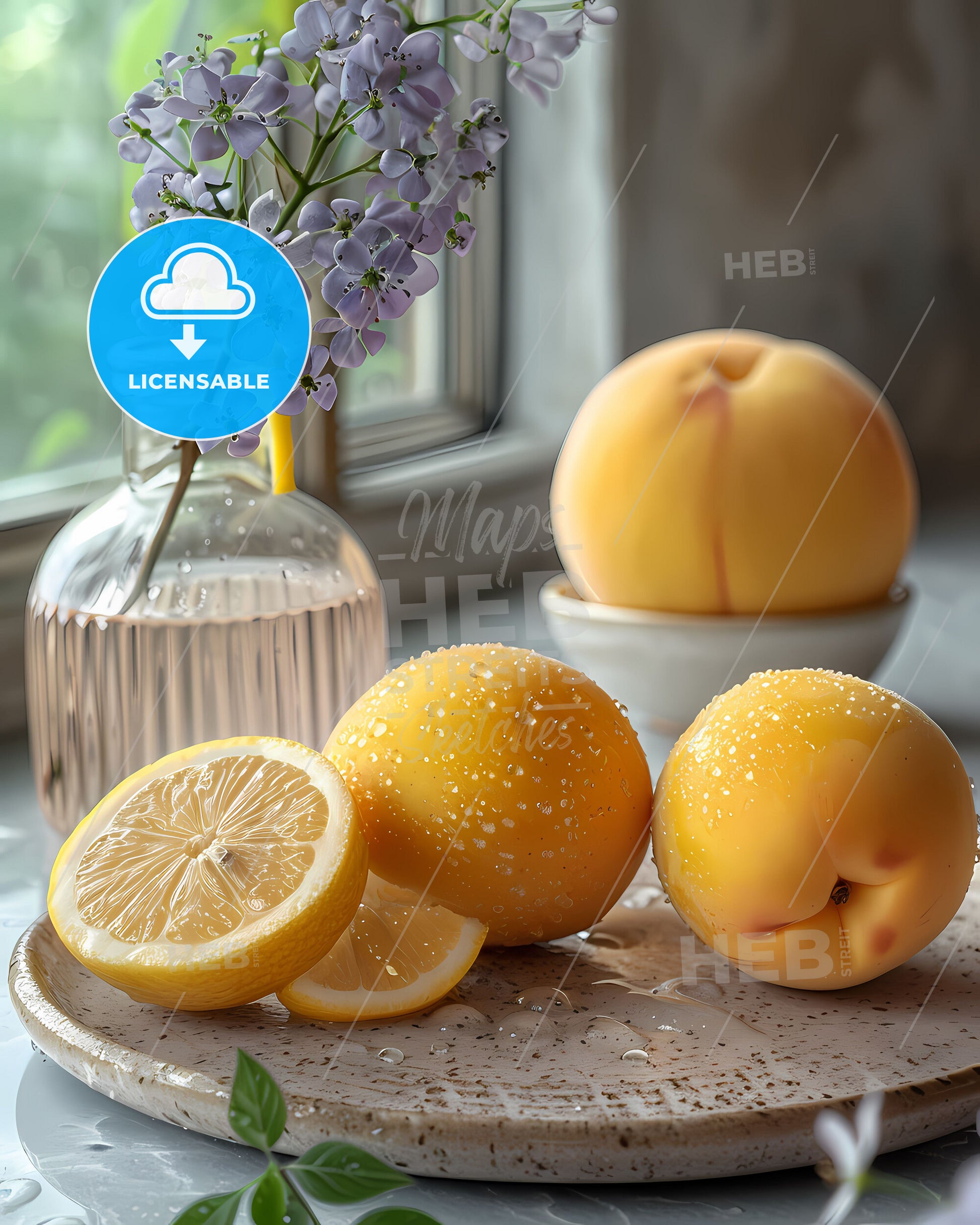 Straight on composition, two boxes, slightly angled sits on top of table, peaches, sliced lemon in the style of minimalist background, commercial photography
