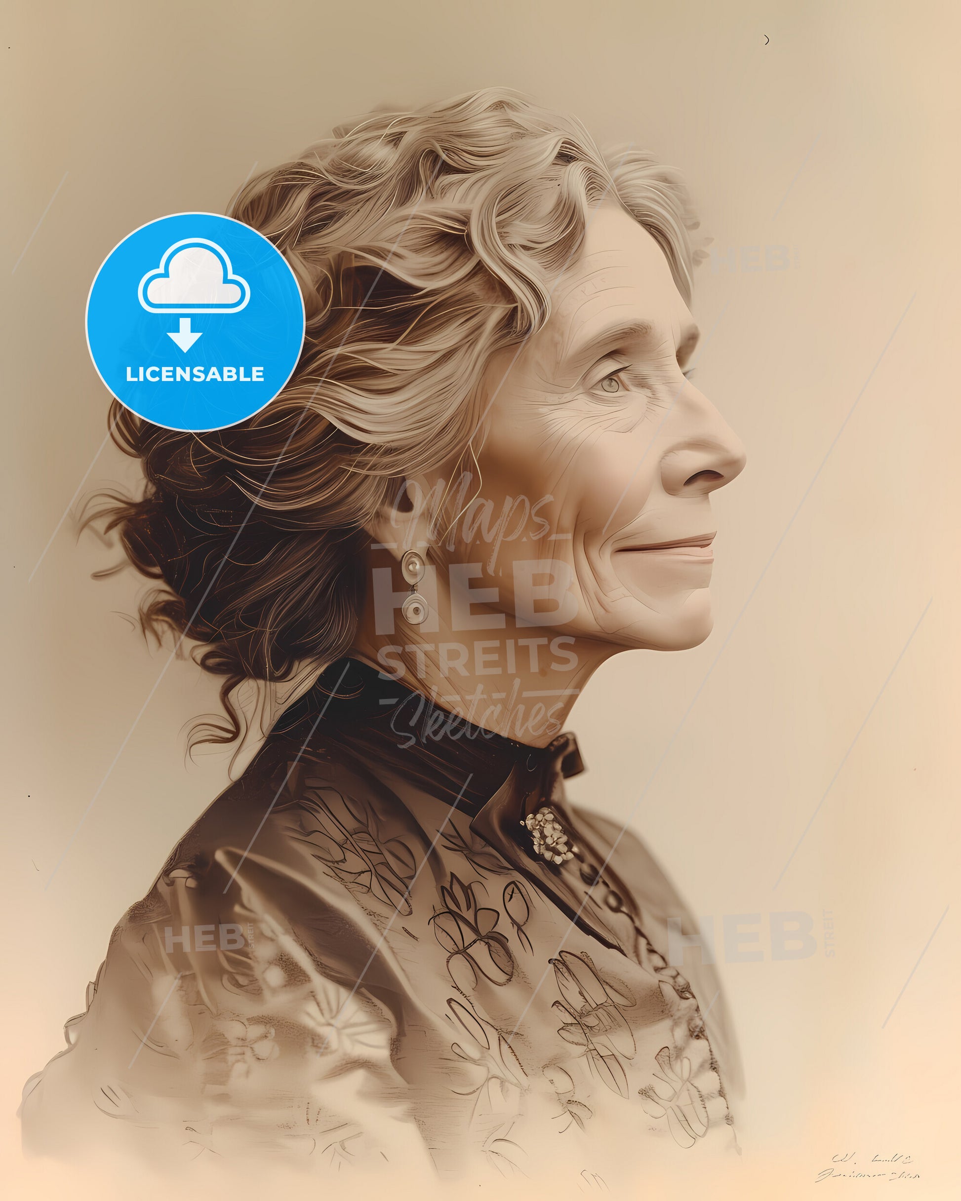 Portrait of Susan B. Anthony, 1820 - 1906, Women's Rights Activist, Leader in the women's suffrage movement, played a key role in securing voting rights for women. smiling. Vintage art illustration on bright beige paper background, sweeping overdrawn lines, subtile colored artwork, that captures the playful spirit and vivid imagination of modern art.