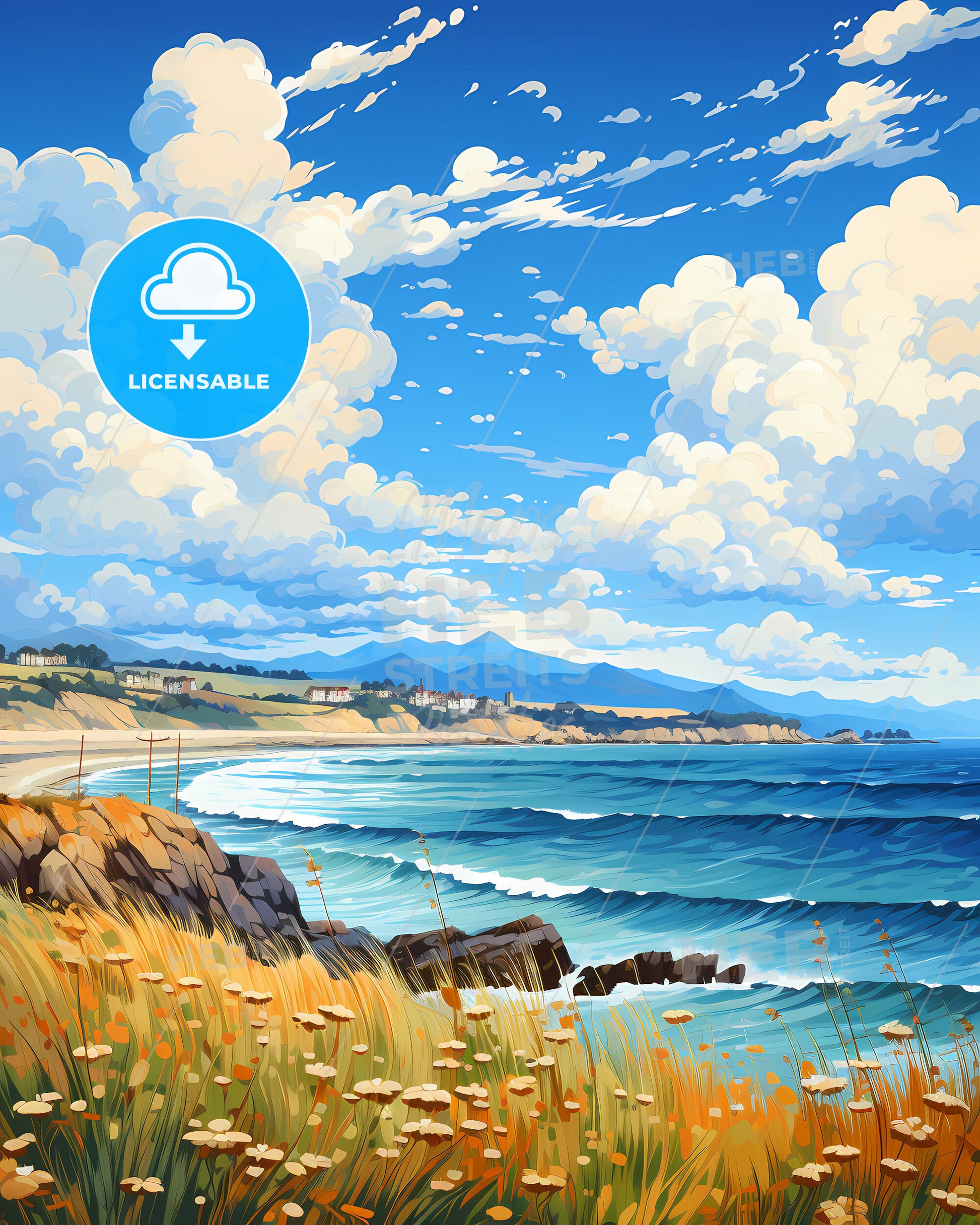 Swansea, Swansea, Skyline. art painting with blue sky some bright clouds in spring. in style of classic advertising illustration with nice gradients. Nice strokes and outlines that captures the playful spirit and vivid imagination of modern art.