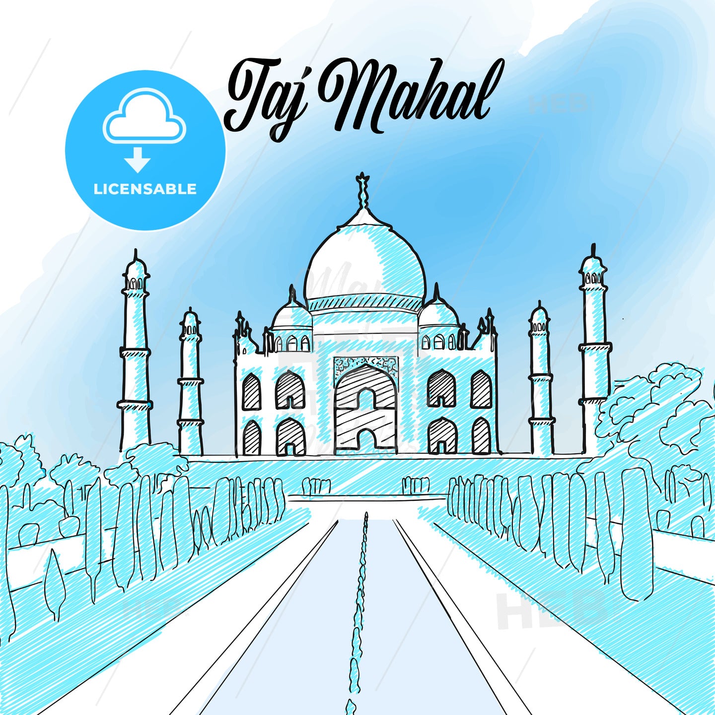 Taj Mahal Landmark Sketch, hand drawn outline illustration for print design and travel marketing