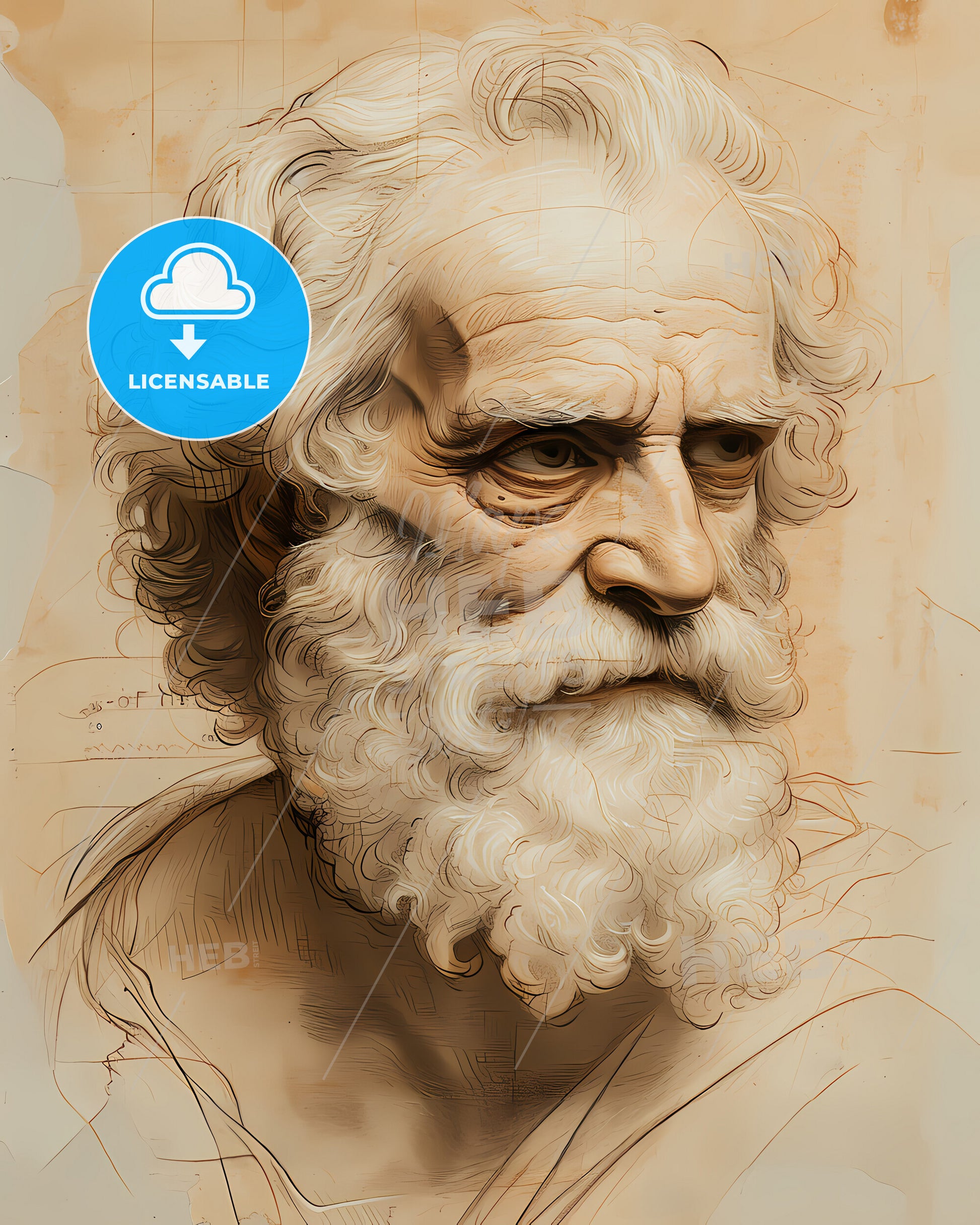 Portrait of Thales of Miletus, c. 624–546 BCE - c. 546–545 BCE, Philosopher and Mathematician, Considered one of the Seven Sages of Greece, made contributions to early philosophy and geometry. smiling. Vintage art illustration on bright beige paper background, sweeping overdrawn lines, subtile colored artwork, that captures the playful spirit and vivid imagination of modern art.