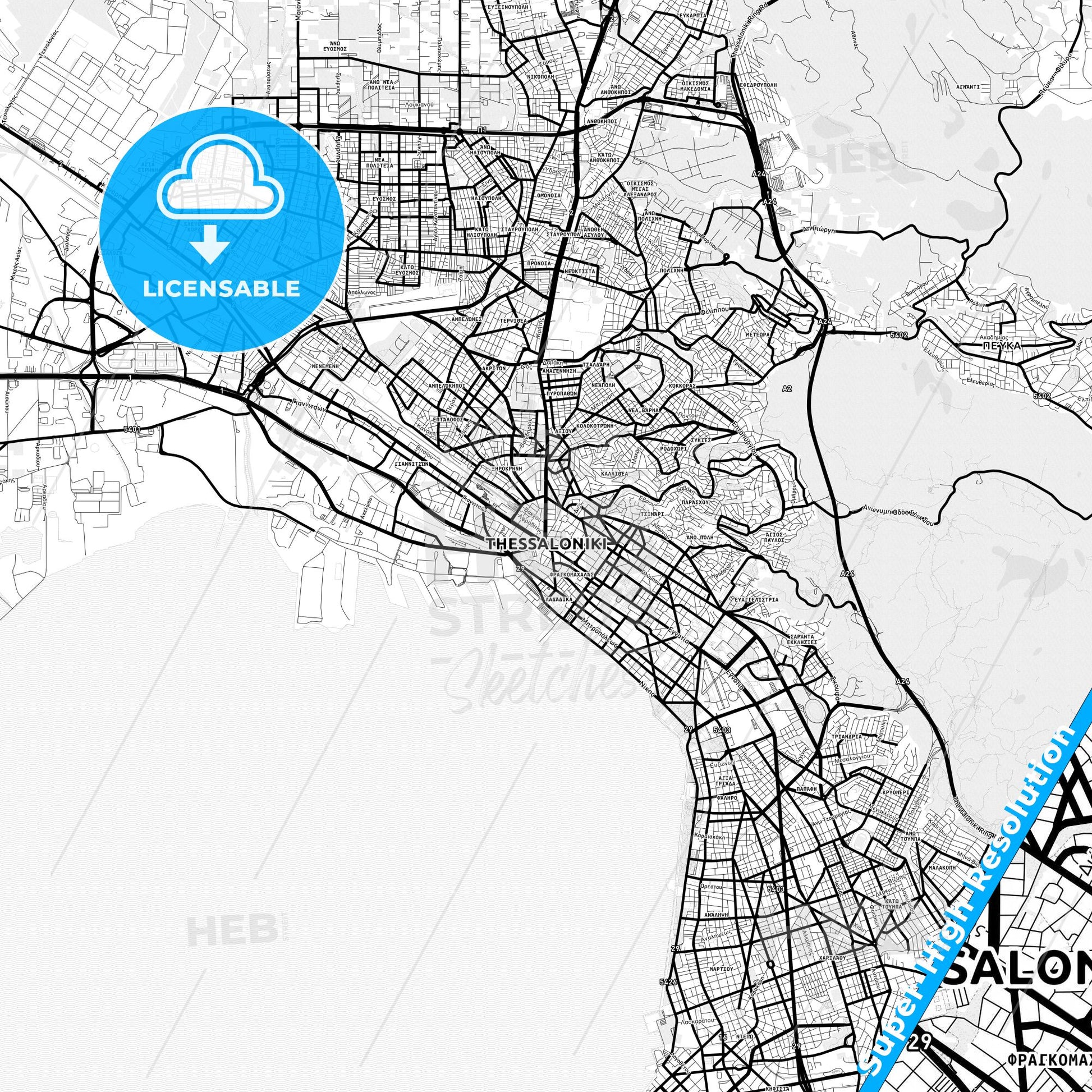 Thessaloniki, Central Macedonia, Greece in high-resolution, minimalist map designed for printed use. This detailed black and white map accurately highlights the street network and urban layout, making it an ideal ready-to-use map for your business.