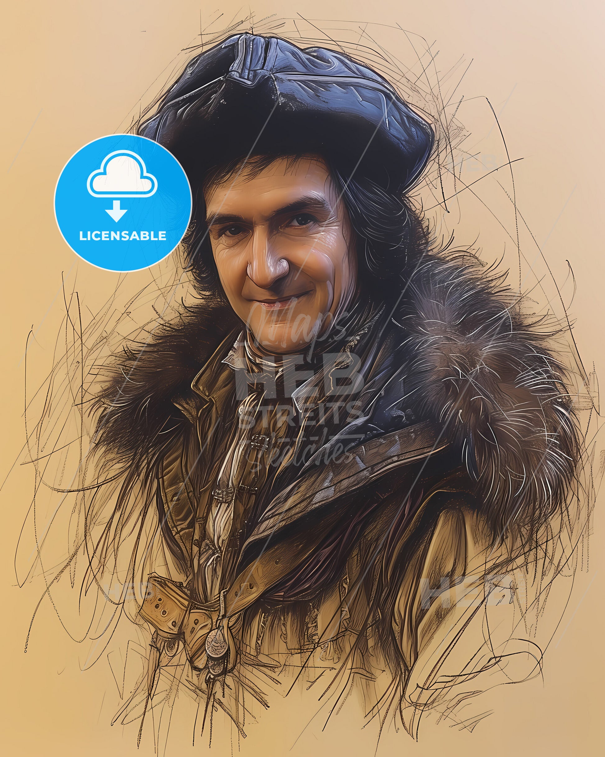 Portrait of Thomas More, 1478 - 1535, Philosopher and Statesman, English statesman and humanist, known for his work "Utopia." - smiling. Vintage art illustration on bright beige paper background, sweeping overdrawn lines, subtile colored artwork, that captures the playful spirit and vivid imagination of modern art.