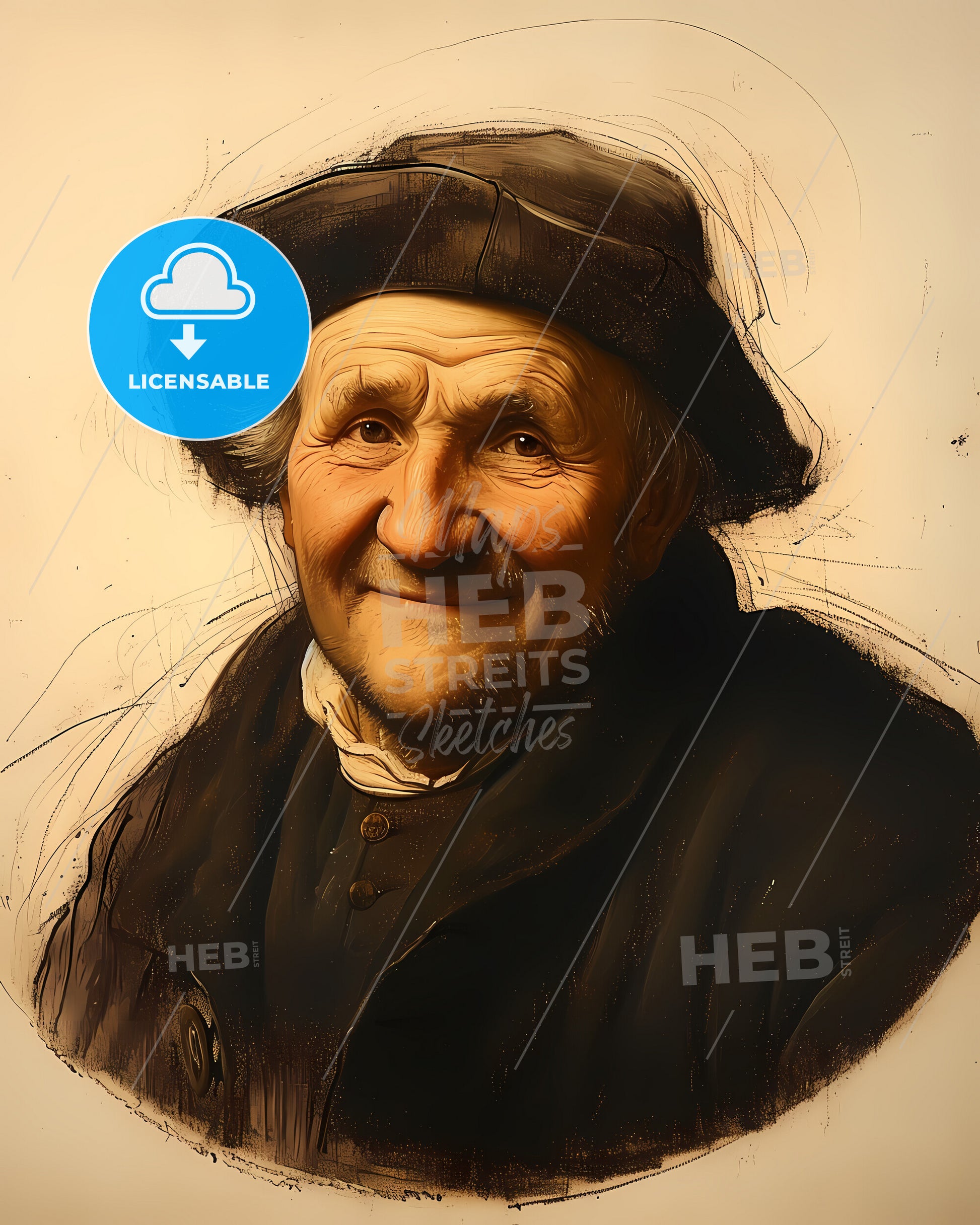 Portrait of Thomas Traherne, 1636 - 1674, Poet and Religious Writer, Metaphysical poet and theologian, known for his mystical and devotional writings. - smiling. Vintage art illustration on bright beige paper background, sweeping overdrawn lines, subtile colored artwork, that captures the playful spirit and vivid imagination of modern art.