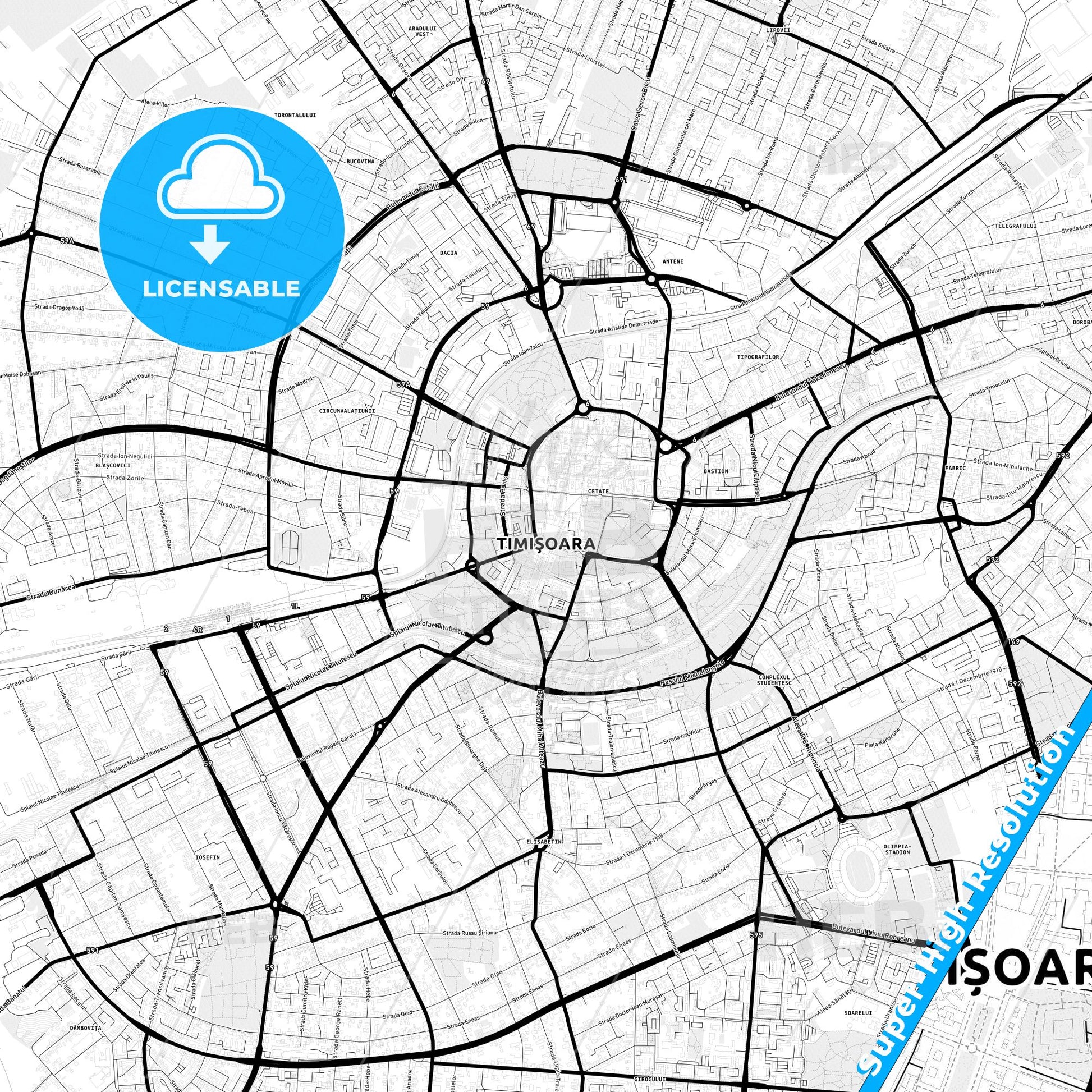 Timișoara, Timiș, Romania in high-resolution, minimalist map designed for printed use. This detailed black and white map accurately highlights the street network and urban layout, making it an ideal ready-to-use map for your business.