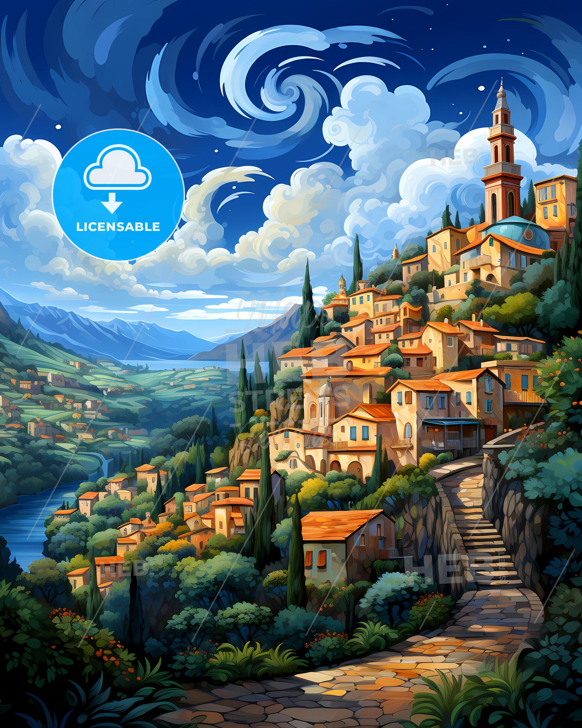 Tivoli, Lazio, Italy, Skyline. art painting with blue sky some bright clouds in spring. in style of classic advertising illustration with nice gradients. Nice strokes and outlines that captures the playful spirit and vivid imagination of modern art.