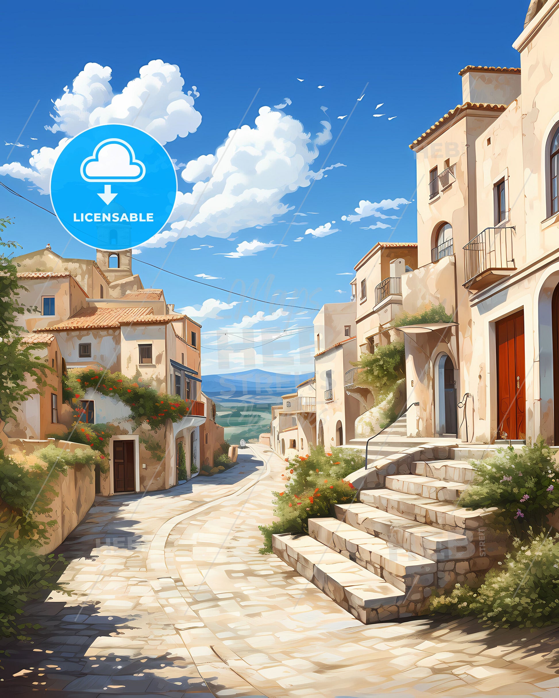 Torre del Greco, Campania, Italy, Skyline. art painting with blue sky some bright clouds in spring. in style of classic advertising illustration with nice gradients. Nice strokes and outlines that captures the playful spirit and vivid imagination of modern art.
