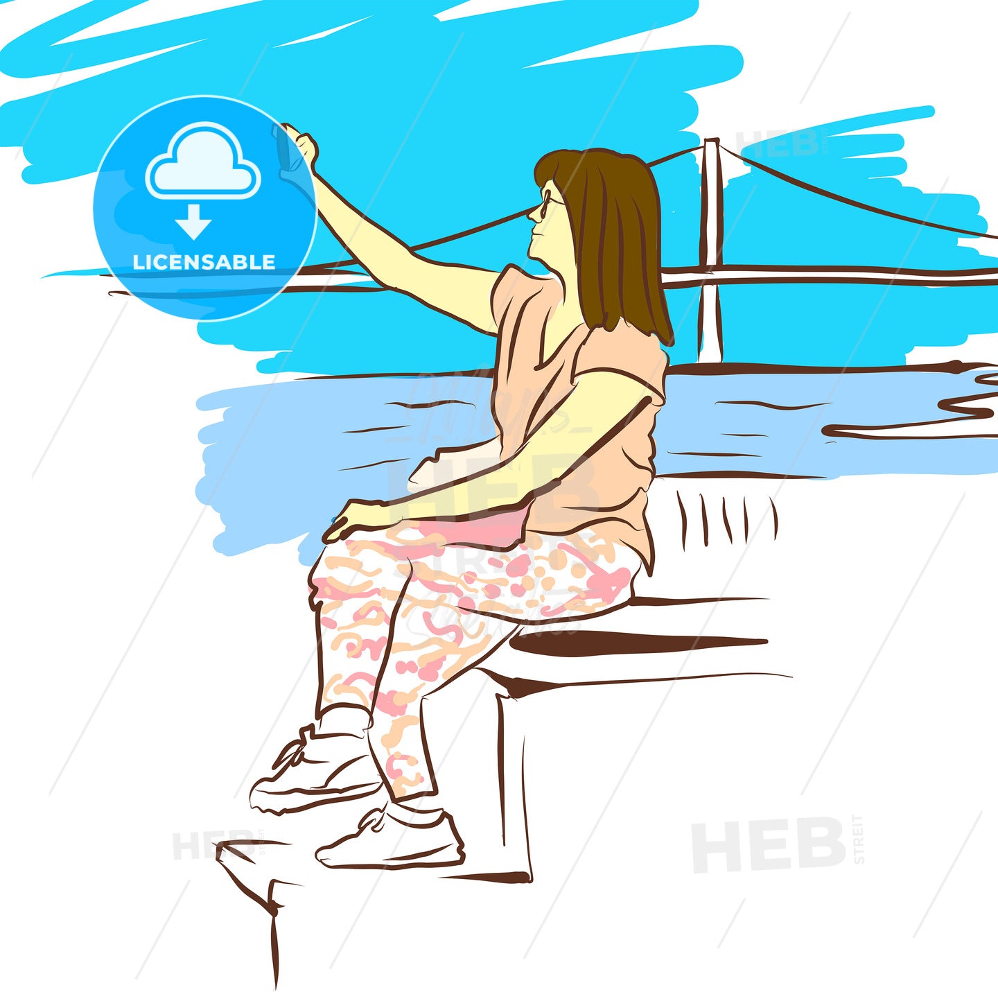 tourist woman makes selfie. hand drawn vector sketch from lisbon portugal.