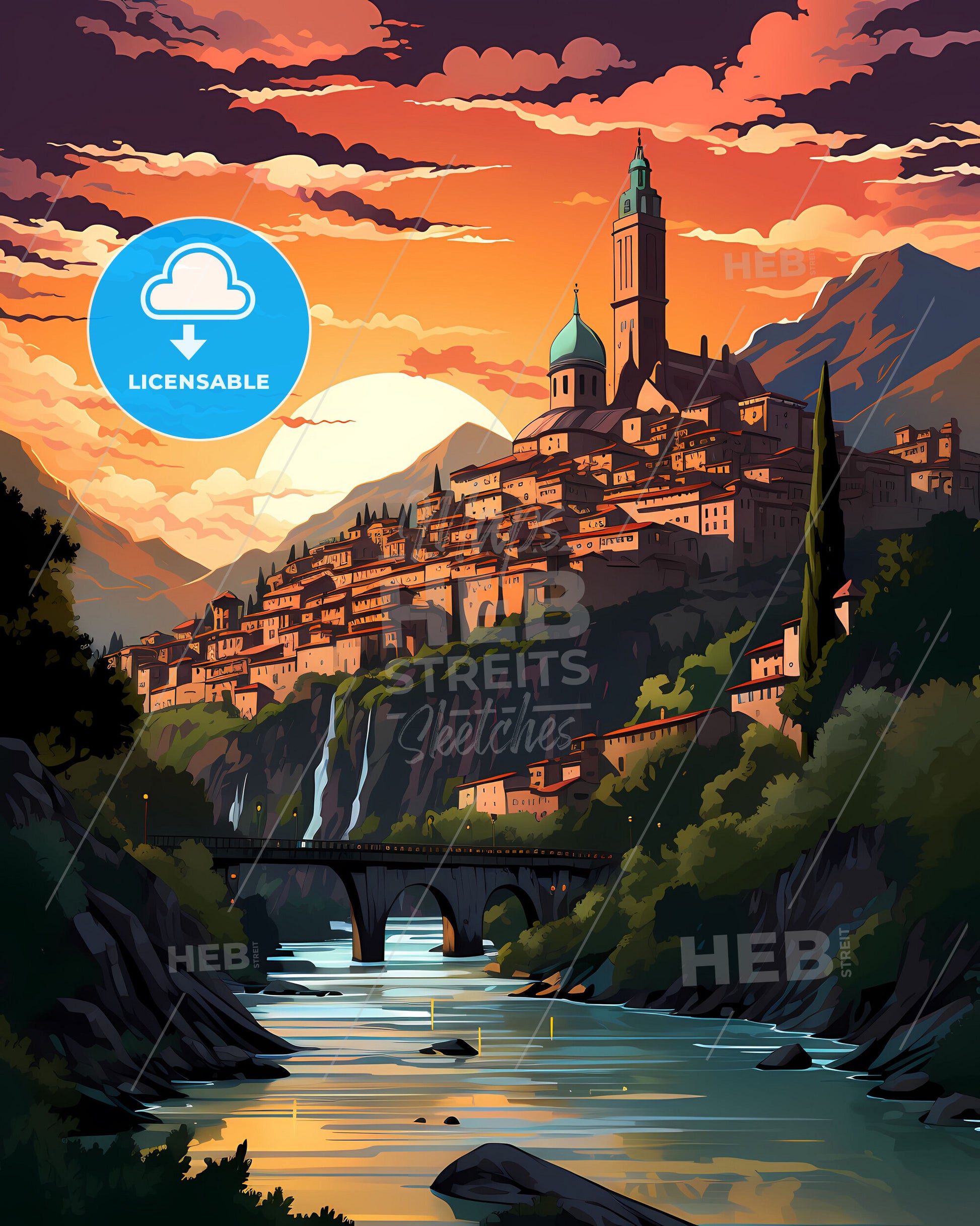 Trento, Trentino-Alto Adige/Südtirol, Italy, Skyline. art painting with blue sky some bright clouds in spring. in style of classic advertising illustration with nice gradients. Nice strokes and outlines that captures the playful spirit and vivid imagination of modern art.