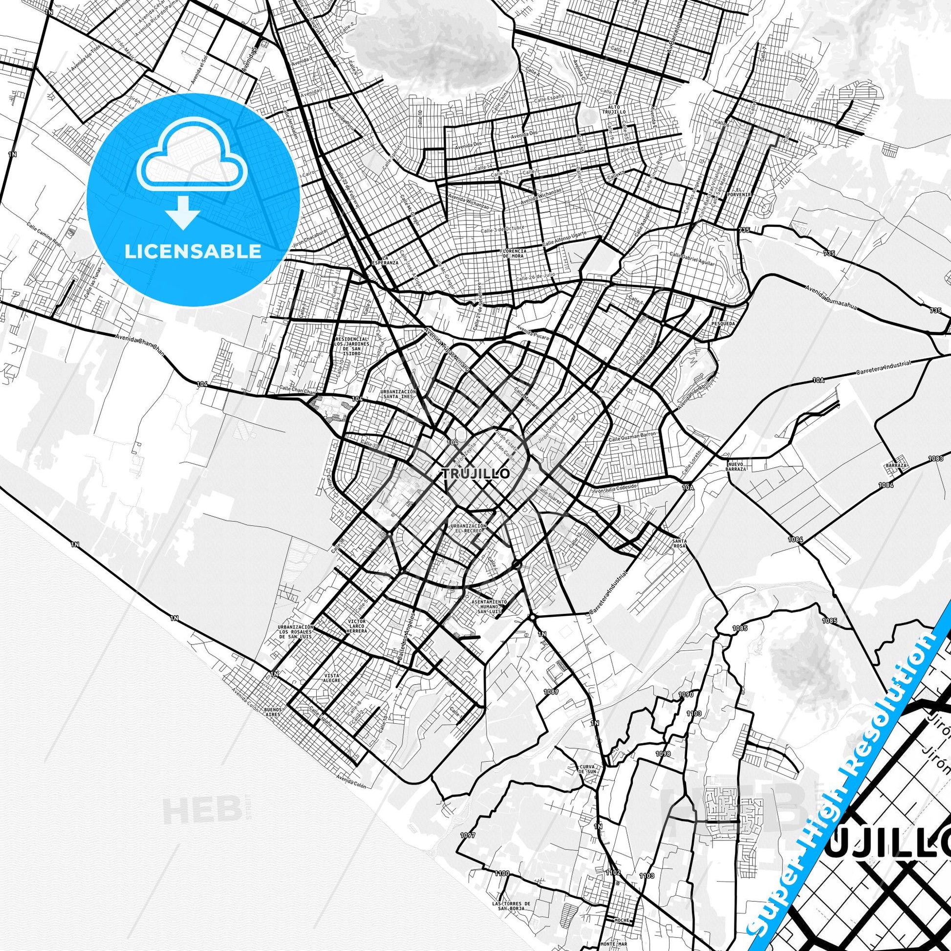 Trujillo, Peru in high-resolution, minimalist map designed for printed use. This detailed black and white map accurately highlights the street network and urban layout, making it an ideal ready-to-use map for your business.