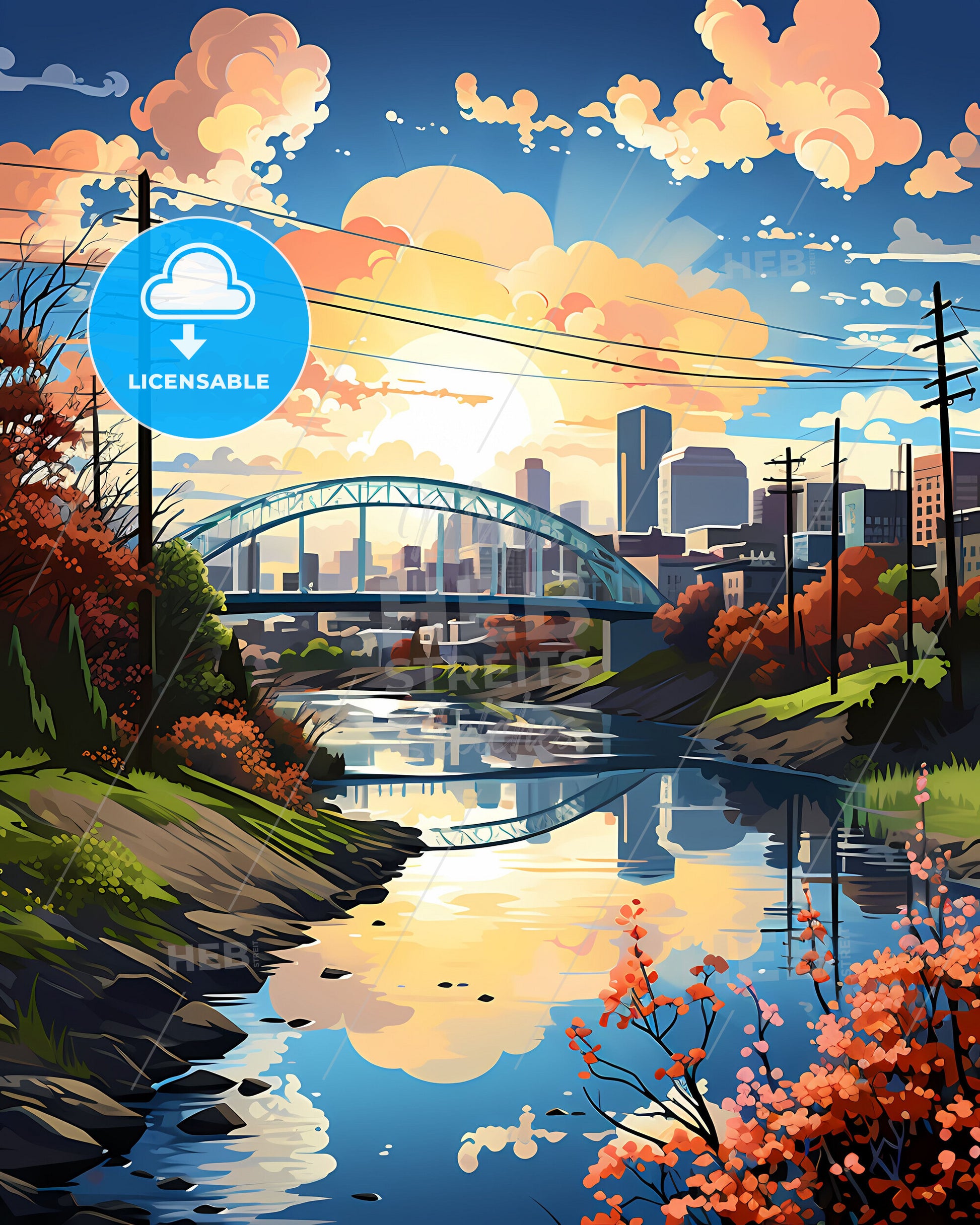 Turlock, California, Skyline. art painting with blue sky some bright clouds in spring. in style of classic advertising illustration with nice gradients. Nice strokes and outlines that captures the playful spirit and vivid imagination of modern art.
