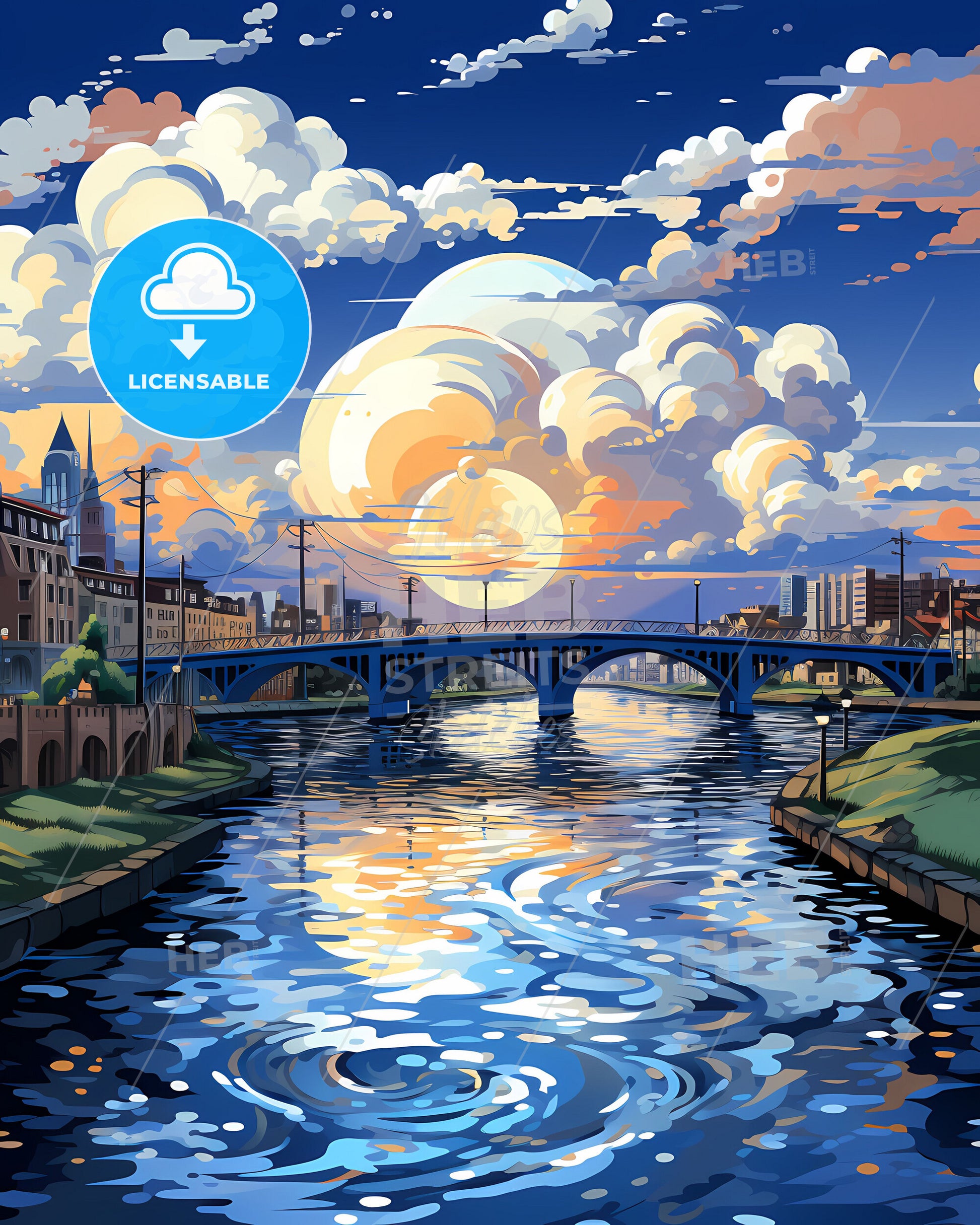Tuscaloosa, Alabama, Skyline. art painting with blue sky some bright clouds in spring. in style of classic advertising illustration with nice gradients. Nice strokes and outlines that captures the playful spirit and vivid imagination of modern art.