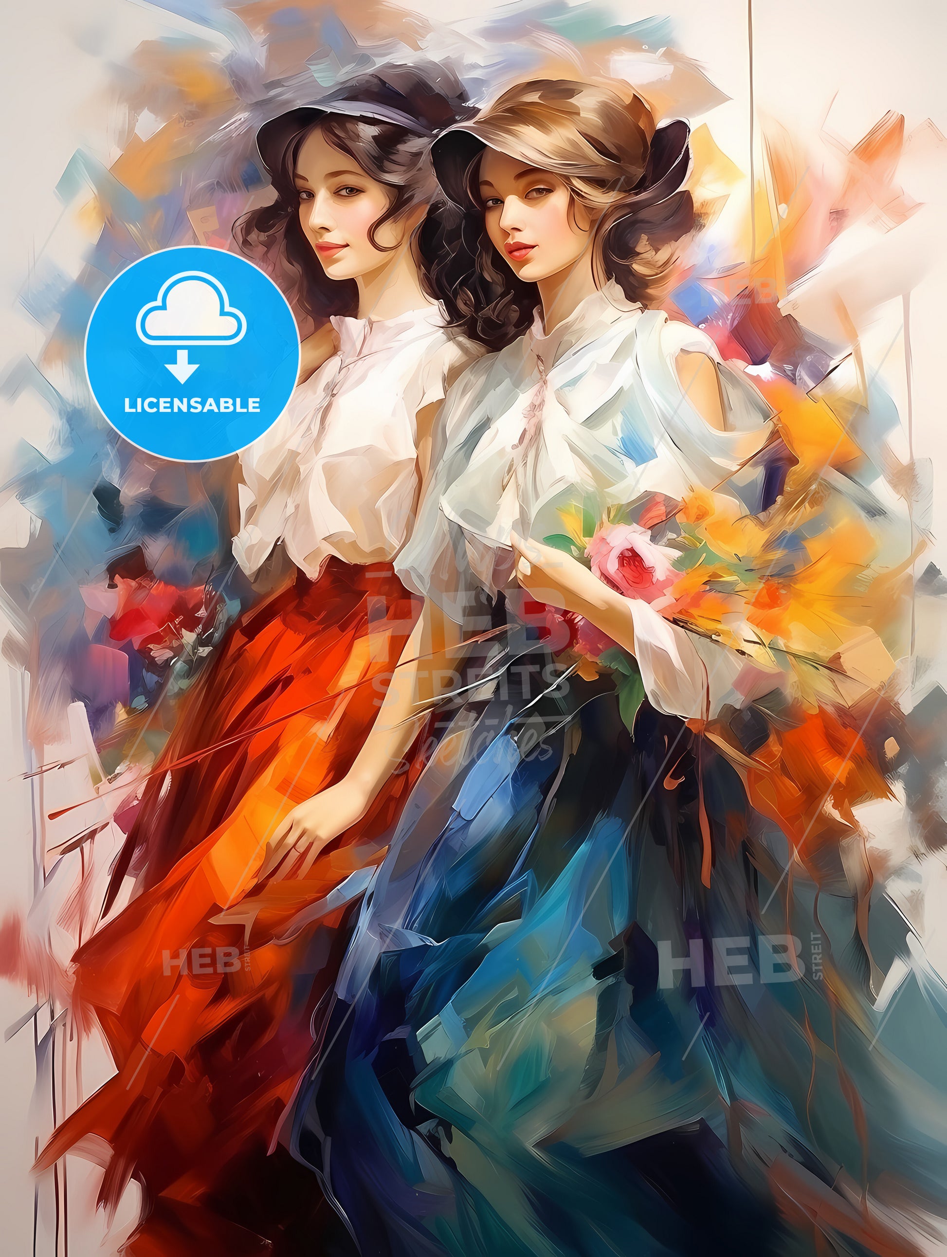 Two Young Beautiful Women Of 1920S - a painting of two women