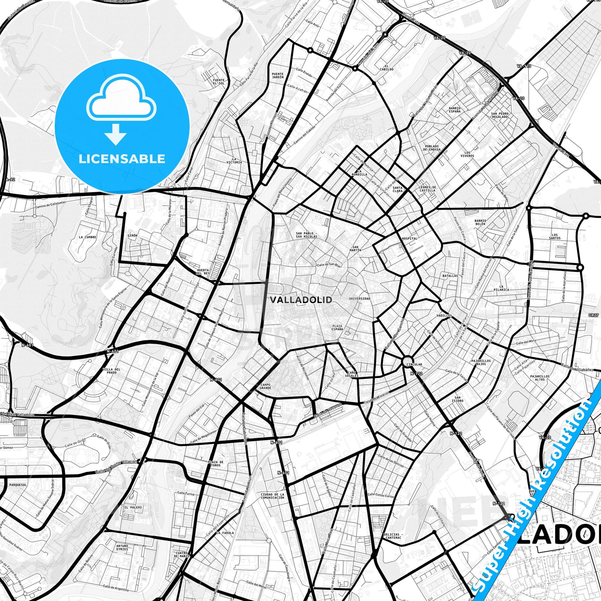 Valladolid, Spain Light Map with Street Names, City Names, and Districts
