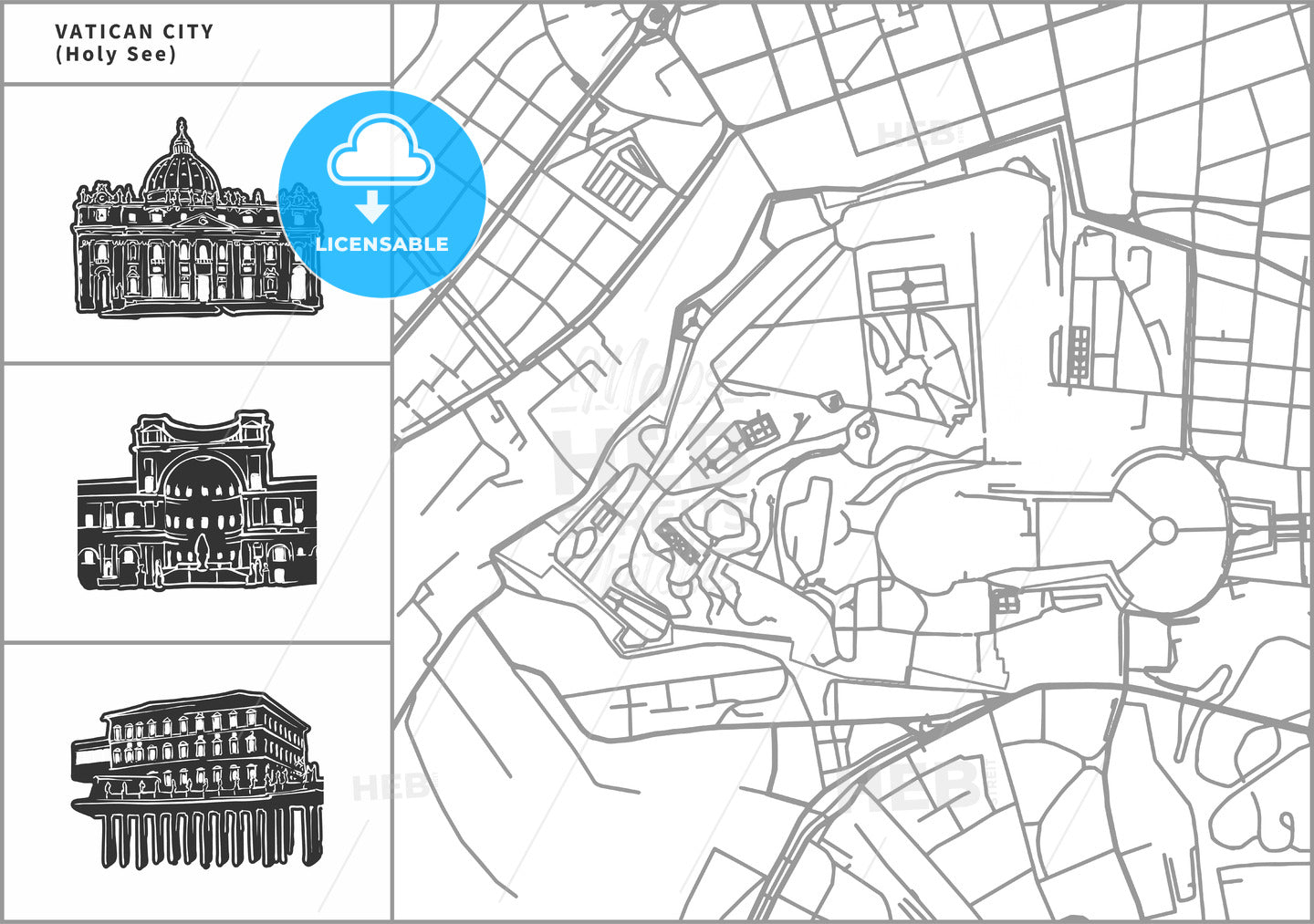 Vatican city map with hand-drawn architecture icons. All drawigns, map and background separated for easy color change. Easy repositioning in vector version.