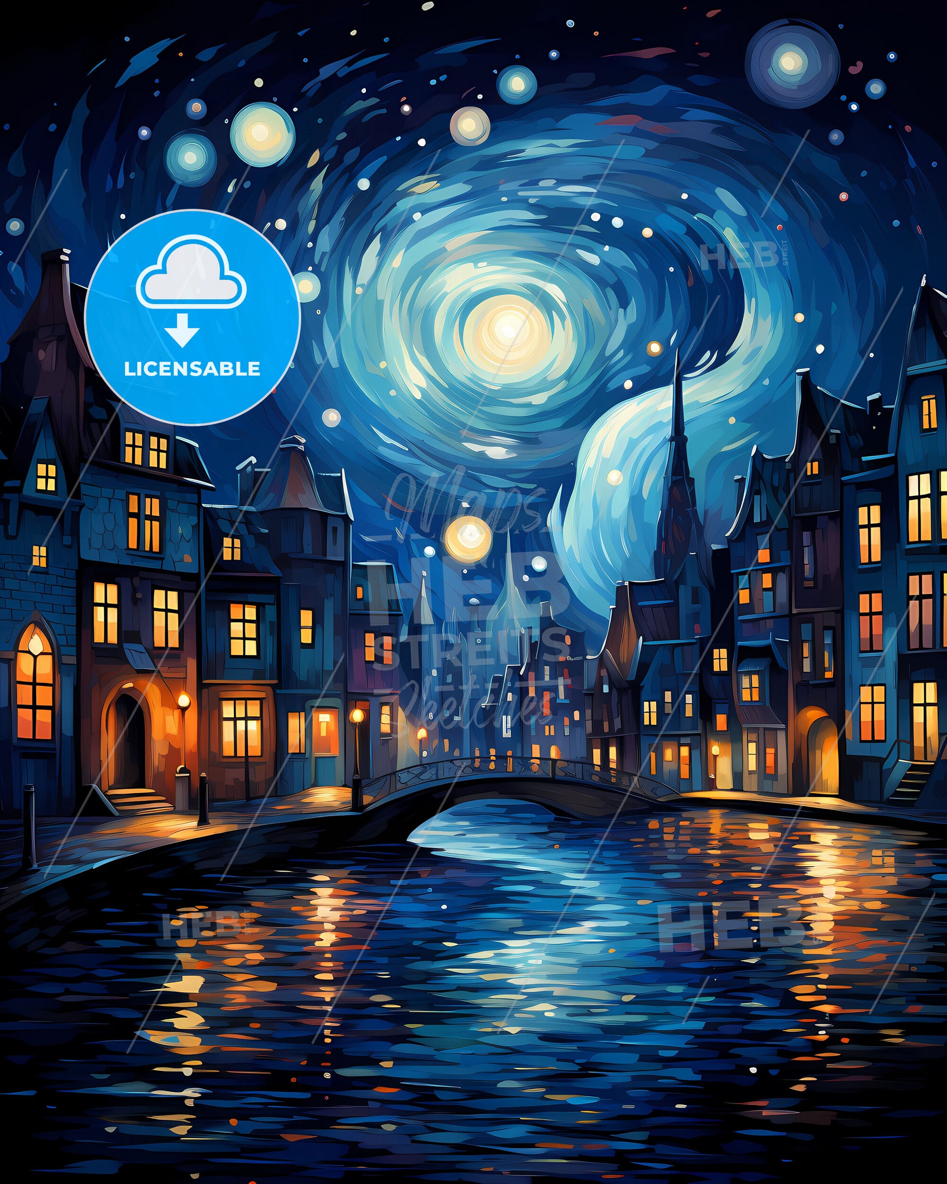 Velsen, North Holland, Netherlands, Skyline. art painting with blue sky some bright clouds in spring. in style of classic advertising illustration with nice gradients. Nice strokes and outlines that captures the playful spirit and vivid imagination of modern art.