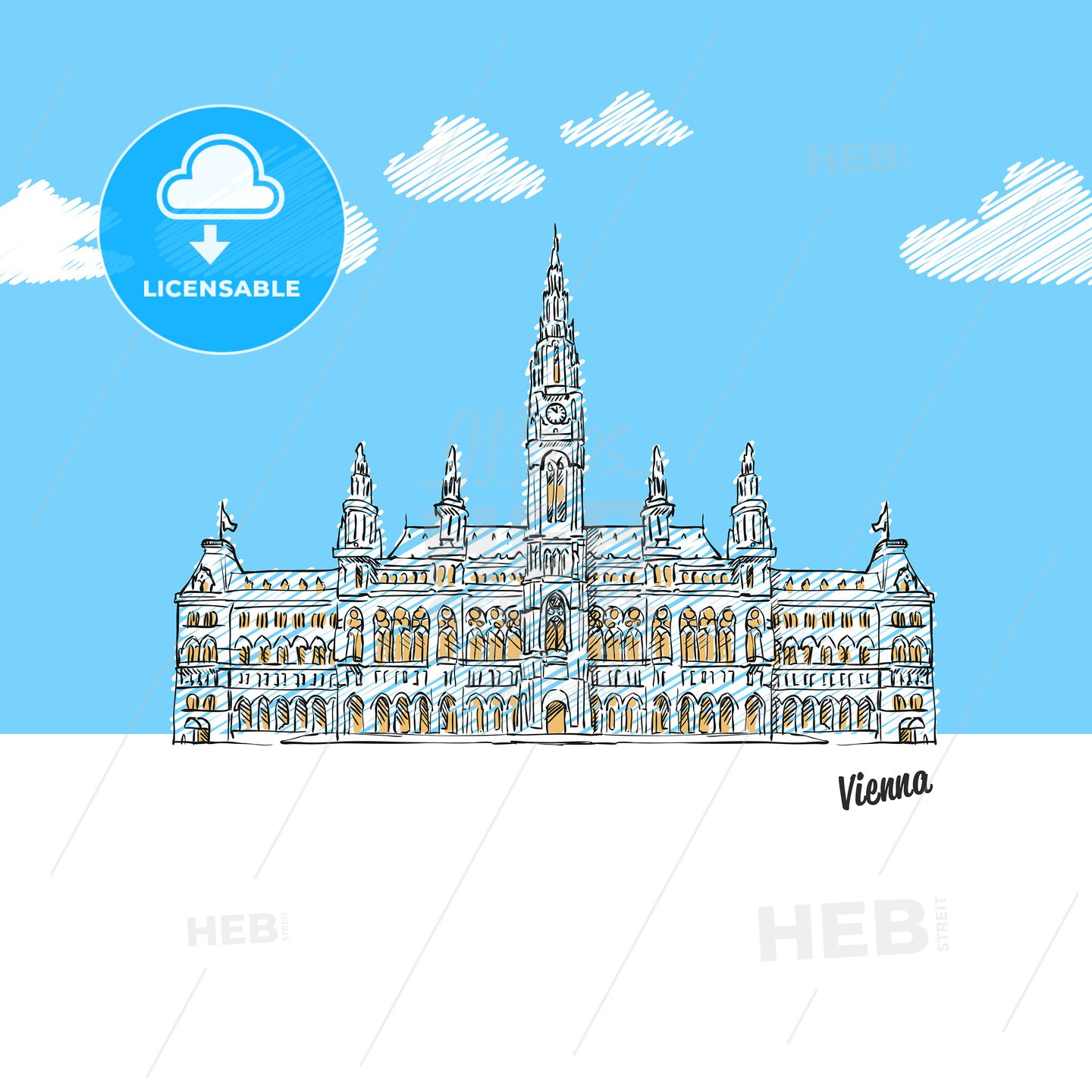Vienna, Austria famous landmark sketch. Lineart drawing by hand. Greeting card icon with title, vector illustration