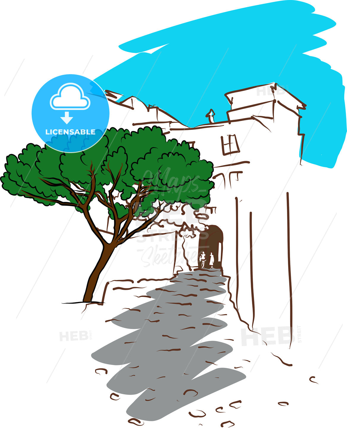 Vintage Castle in Lisbon. Hand drawn graphic landscape. Engraved hand drawn old sketch. Stone citadel with path.