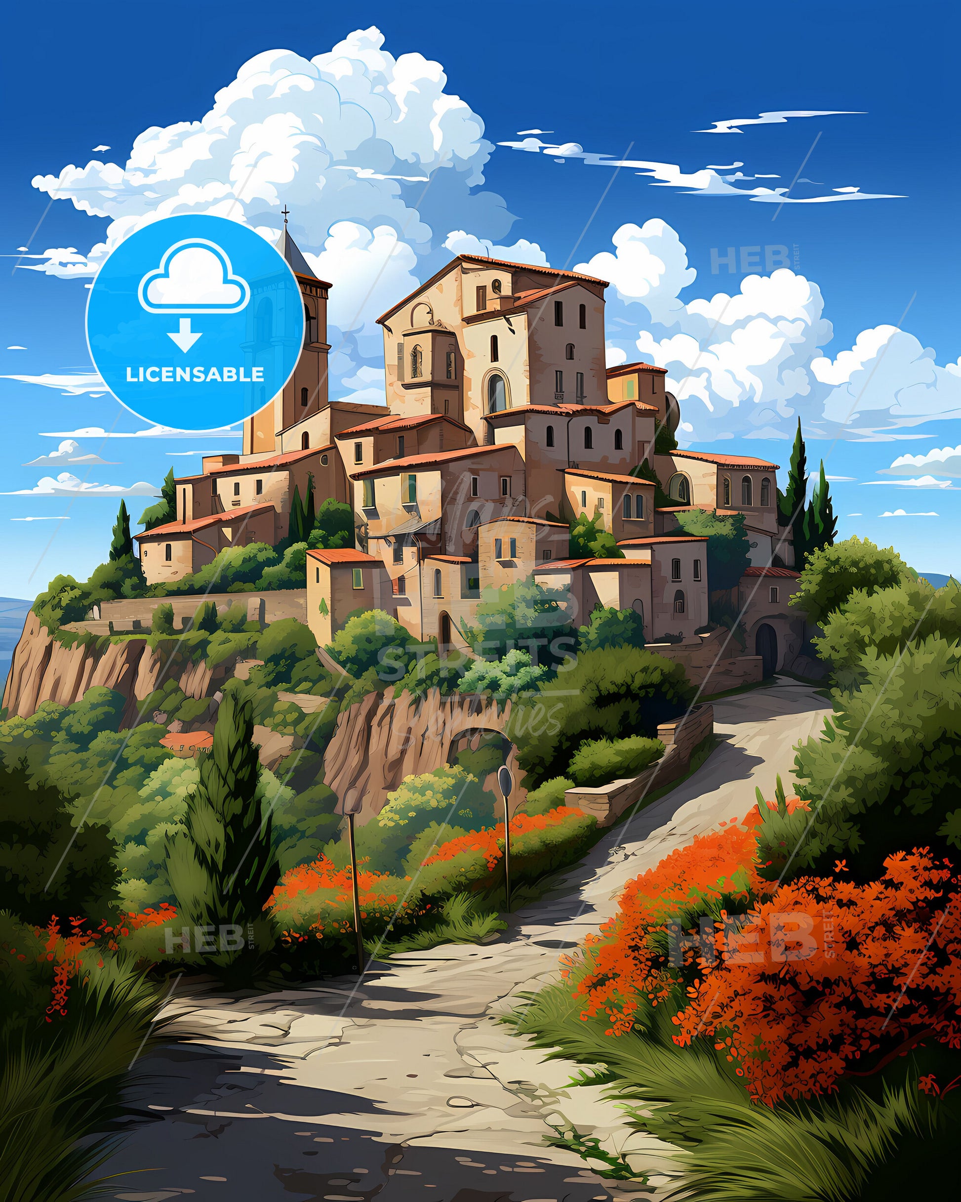 Viterbo, Lazio, Italy, Skyline. art painting with blue sky some bright clouds in spring. in style of classic advertising illustration with nice gradients. Nice strokes and outlines that captures the playful spirit and vivid imagination of modern art.