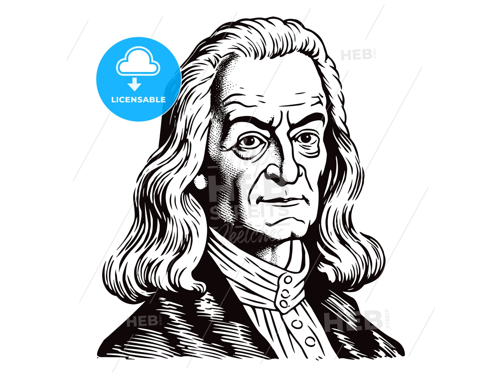Voltaire Portrait. - a black and white drawing of a man with long hair