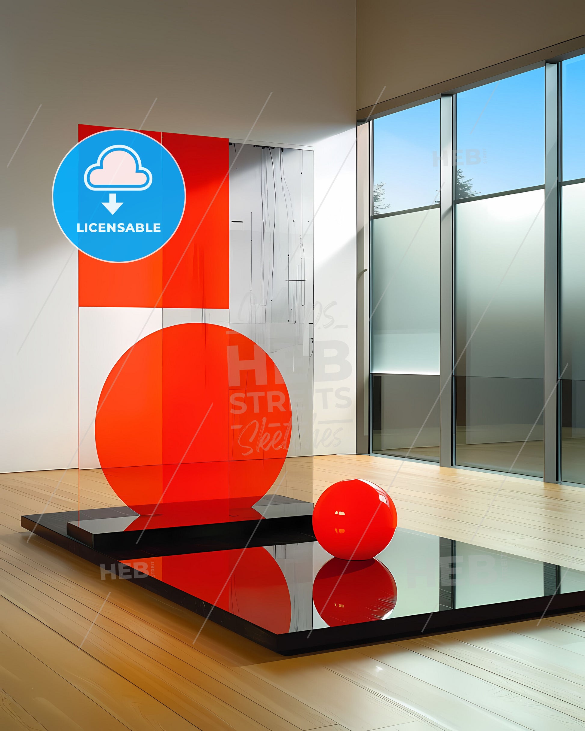 Abstract Geometric Bauhaus Art: Vibrant Red and White Objects on Black Canvas