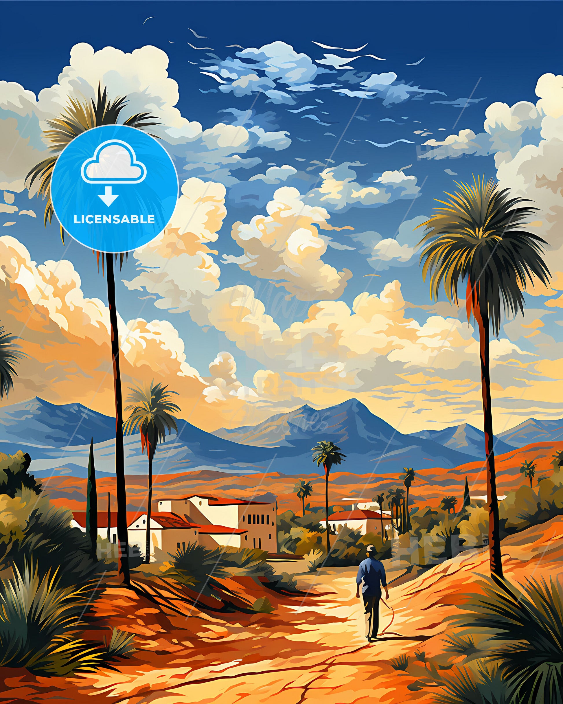 Westminster, California, a man walking on a dirt road with palm trees and mountains