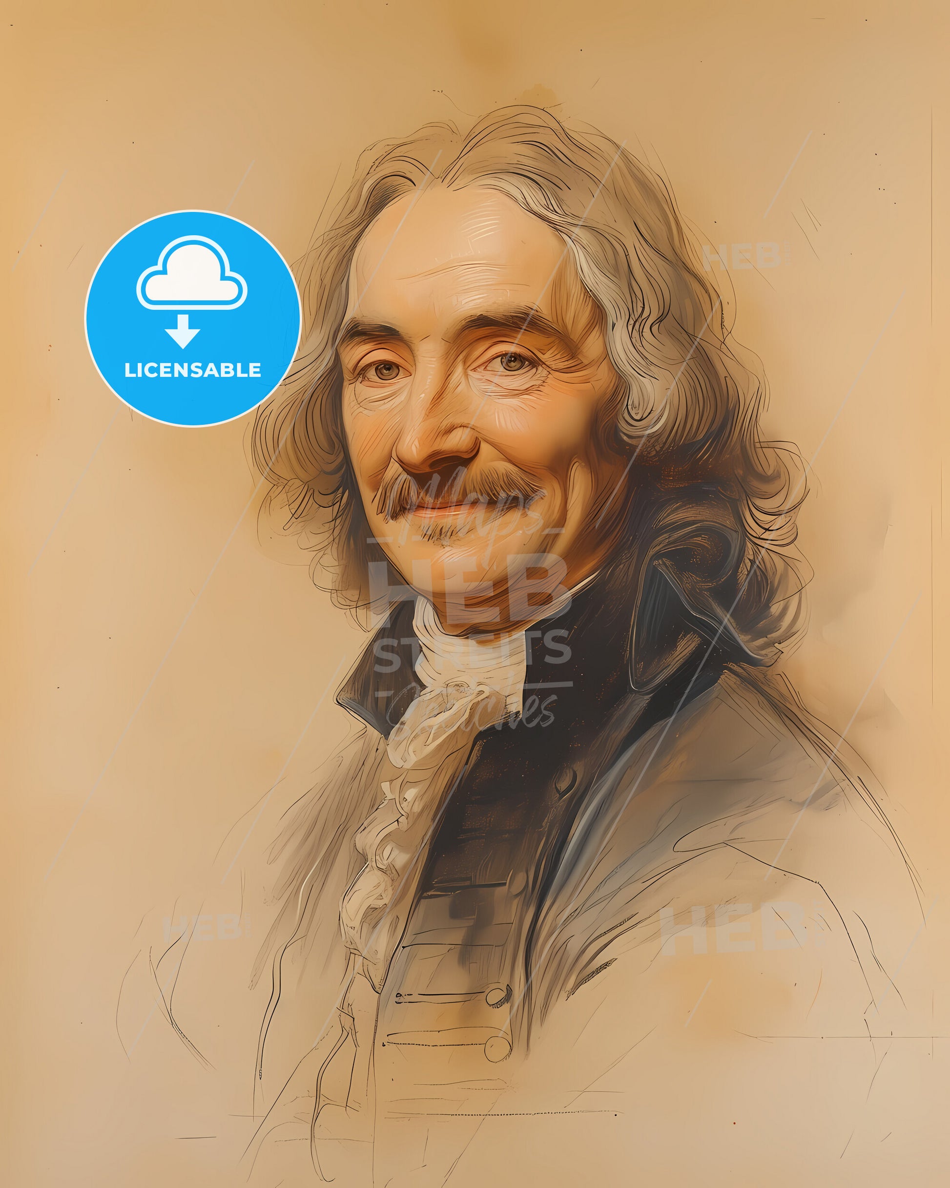 Portrait of William Penn, 1644 - 1718, Founder of Pennsylvania - smiling. Vintage art illustration on bright beige paper background, sweeping overdrawn lines, subtile colored artwork, that captures the playful spirit and vivid imagination of modern art.