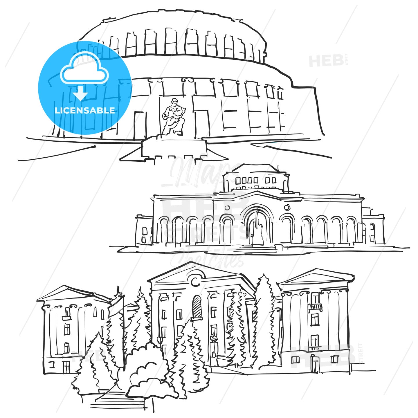 Yerevan Armenia Famous Buildings, Monochrome Outlined Travel Landmarks, Scalable Vector Illustration