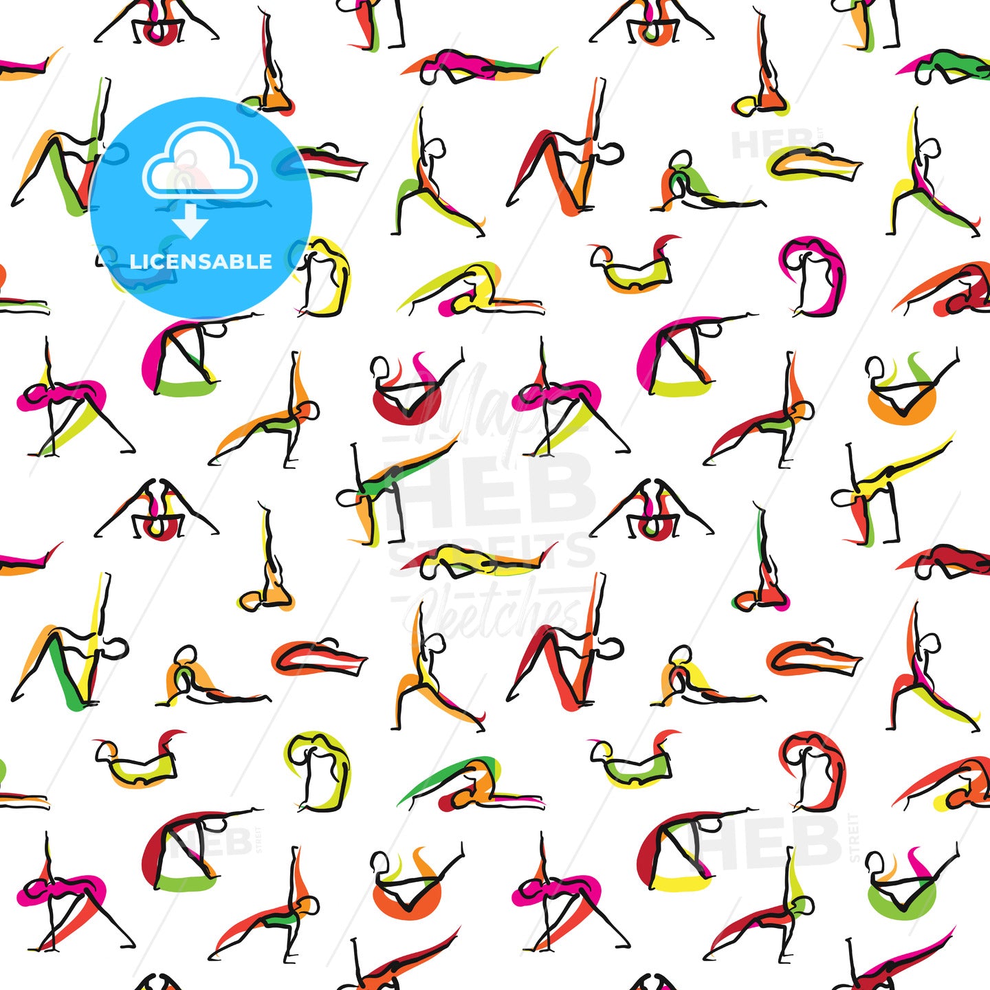 Yoga seamless wallpaper pattern, hand drawn sketches with colored swipe on white backgound. Vector art.