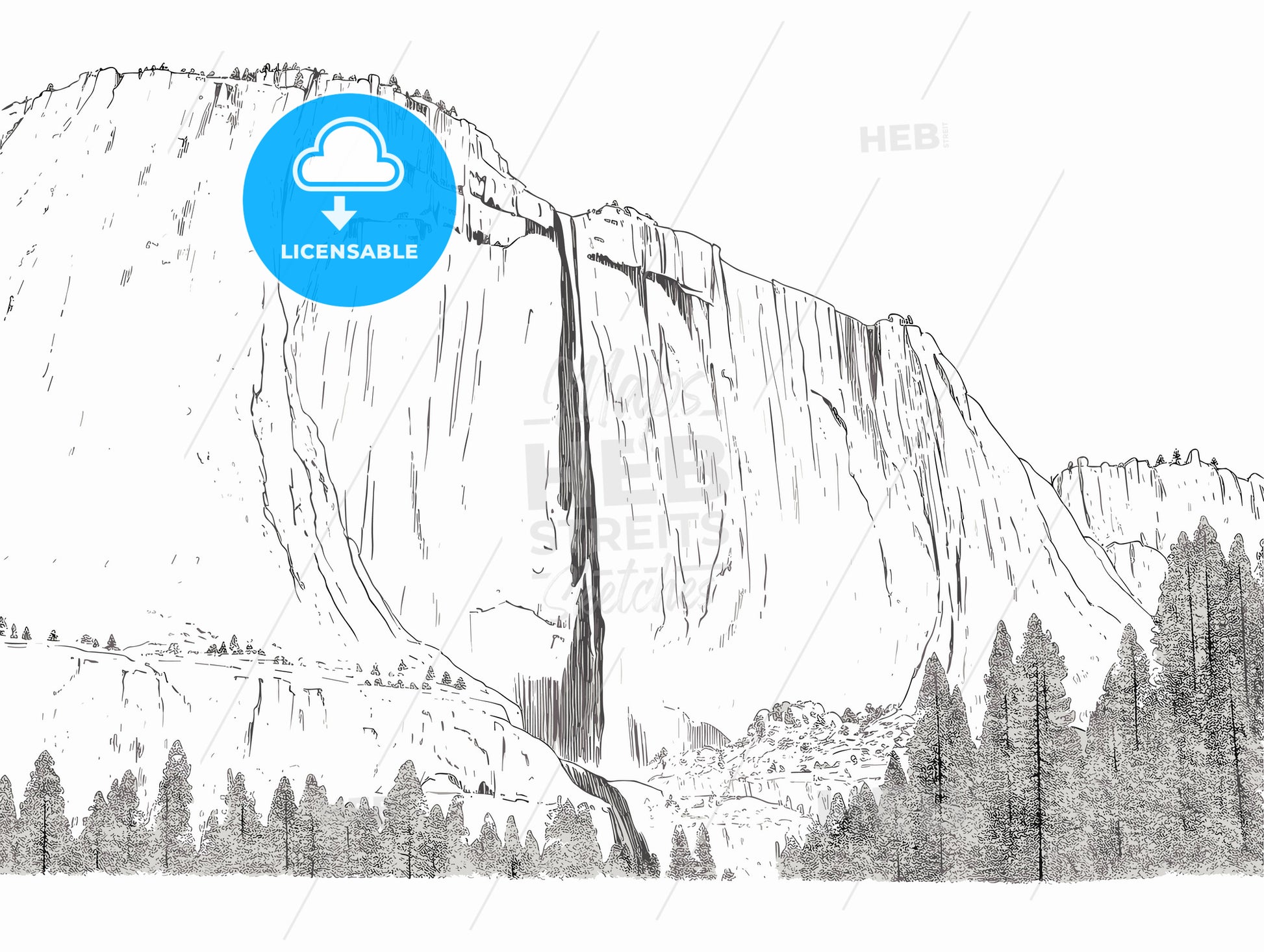 Yosemite Falls In Yosemite National Park - a black and white drawing of a mountain with trees