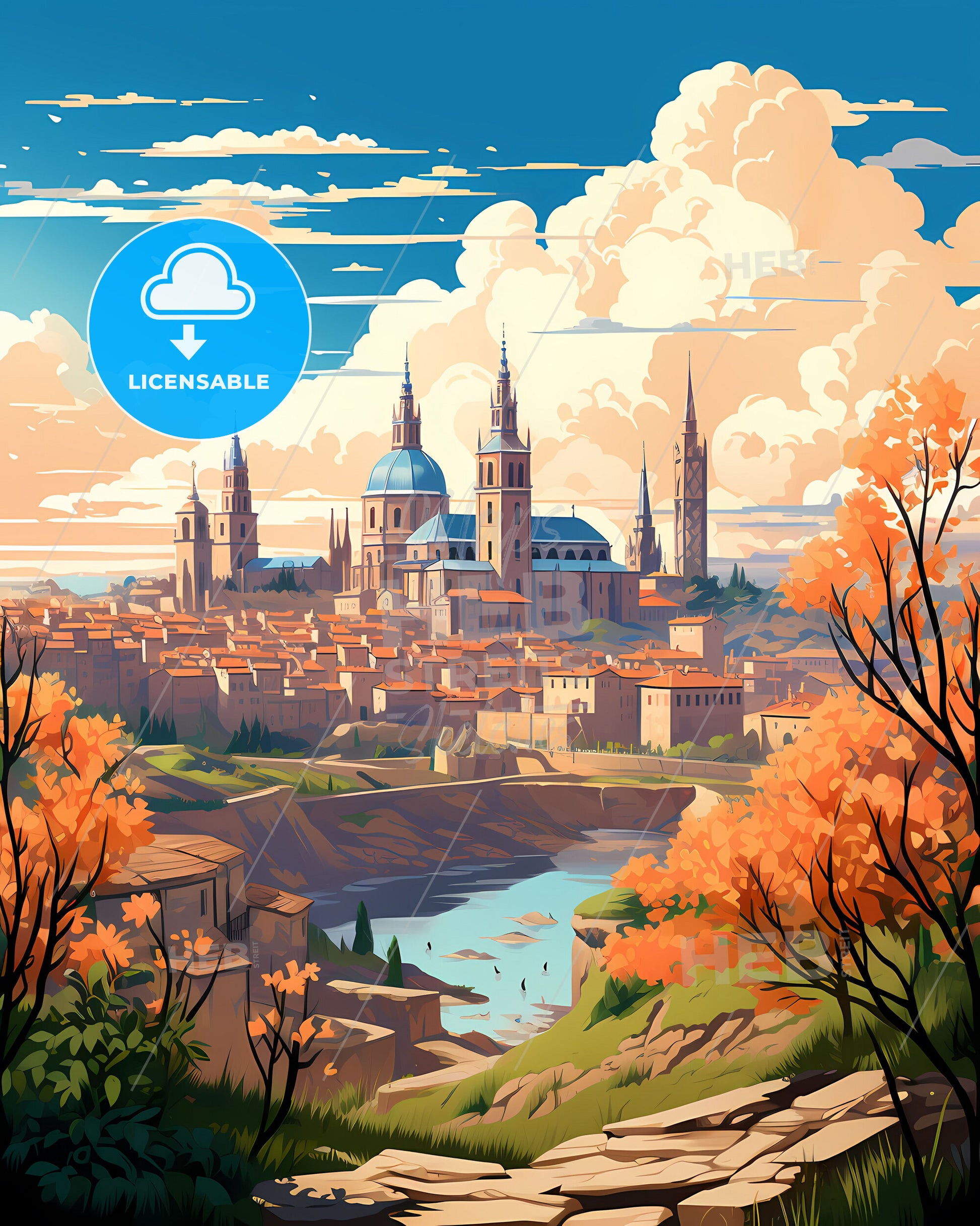 Zaragoza, Spain, Skyline. art painting with blue sky some bright clouds in spring. in style of classic advertising illustration with nice gradients. Nice strokes and outlines that captures the playful spirit and vivid imagination of modern art.