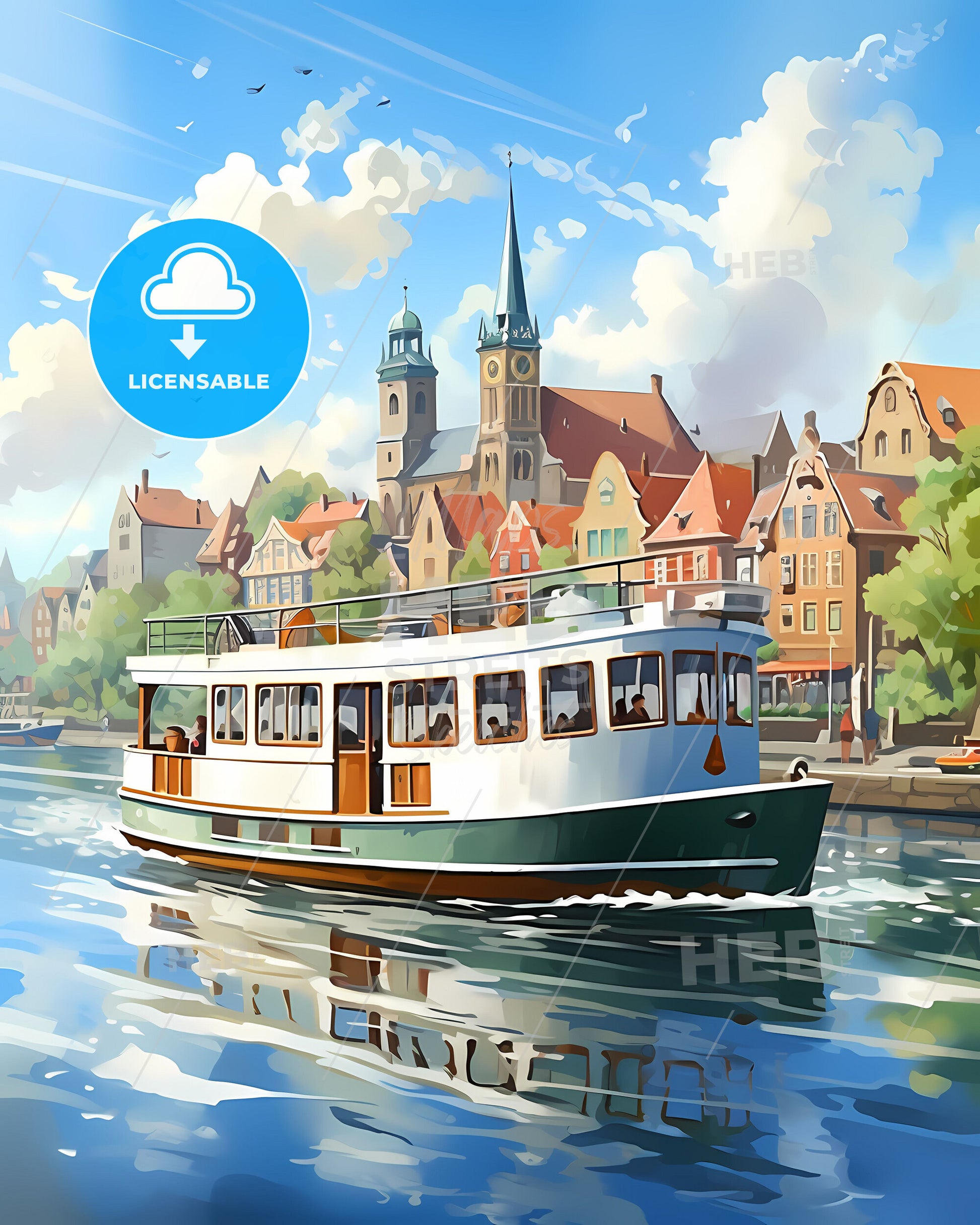 Zwijndrecht, South Holland, Netherlands, Skyline. art painting with blue sky some bright clouds in spring. in style of classic advertising illustration with nice gradients. Nice strokes and outlines that captures the playful spirit and vivid imagination of modern art.